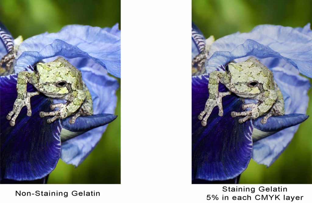 When making color prints, using a yellowish gelatin will cause blues, turquoises, and cyans in the print to come out muddy. A clear gelatin will allow for brighter colors in a print.